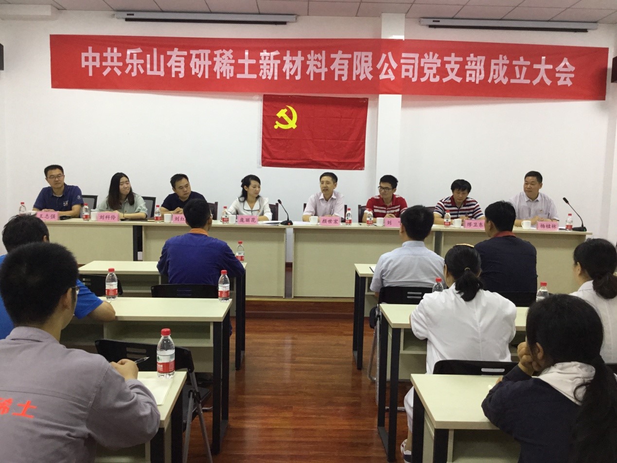 2018年7月27日上午9點,在莊嚴的國歌聲中,中共樂山有研稀土新材料有限公司黨支部成立大會隆重召開。峨邊縣委組織部、“兩新”組織黨工委副書記龐麗花及園區黨工委劉紅果、劉科伶,有研稀土黨支部書記、常務副總經理顏世宏,有研新材綜合管理部副部長劉寧,有研新材紀檢辦公室主任繆衛東,有研稀土生產總調室主任王志強及樂山有研全體黨員、入黨積極分子共30余人出席了大會,共同見證了這一重要歷史時刻。會議由樂山有研總經理楊桂林同志主持。
