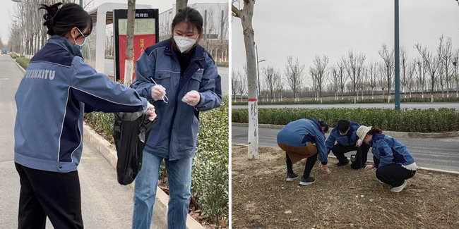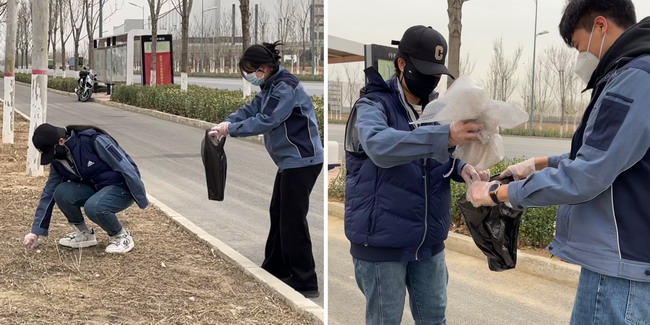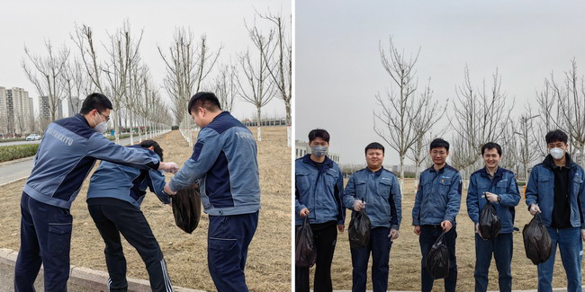 團員青年們身穿工服,手拿垃圾袋等工具分工合作,對燕郊基地南門附近的垃圾、雜草、綠化帶里的紙屑、白色垃圾等進行清理。在南門形成了一道亮麗的風景線。經過一段時間的清理,南門附近馬路煥發出了整潔的面貌。