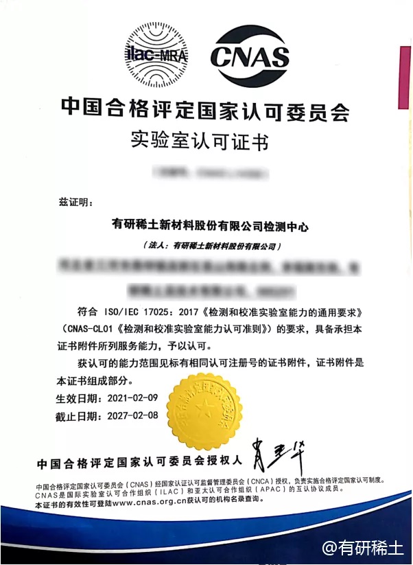 2021年2月9日,有研稀土新材料股份有限公司檢測中心正式通過CNAS實驗室現(xiàn)場評審和后續(xù)考察,成功獲得實驗室國家認可,一舉躋身國家認可實驗室行列。本次認可標(biāo)志著有研稀土檢測中心符合了CNAS-CL01:2018《檢測和校準(zhǔn)實驗室能力認可準(zhǔn)則》的要求,具備了按照國際認可準(zhǔn)則開展檢測服務(wù)的技術(shù)能力。