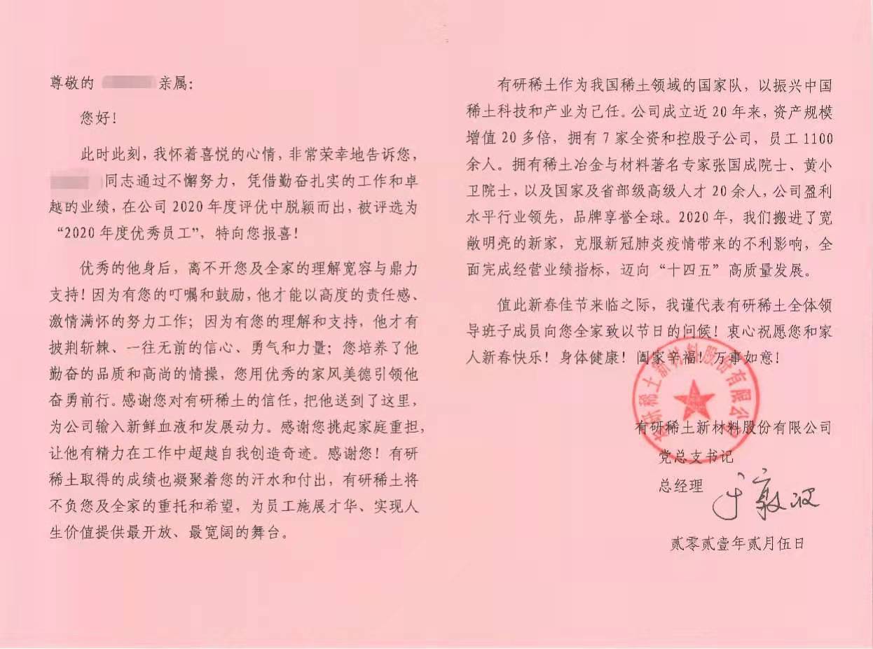 新年前夕,有研稀土黨總支書記、總經(jīng)理于敦波向每名優(yōu)秀員工親屬寫去了感謝信。感謝優(yōu)秀員工這一年來的辛勤努力與付出;感謝員工親屬對有研稀土的信任和無私奉獻,讓他們有披荊斬棘、一往無前的信心、勇氣和力量,讓他們有精力在工作中超越自我、創(chuàng)造佳績!