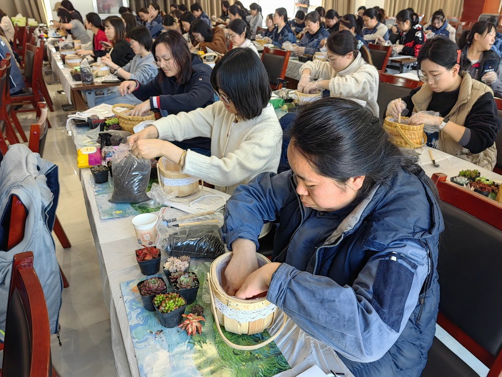 授課老師為大家介紹了多肉植物的生活習性特點,同時就澆水、日照等種植中常見的問題做了較為實用的講解,接著為大家示范從修根到培土,如何種植多肉植物。在授課教師的細心指導下,大家變身巧手花匠,挑選品種、移植多肉、布盆造景,在場的每位女職工用親手種植的美麗盆栽,為自己送上了最特別的女神節禮物。
